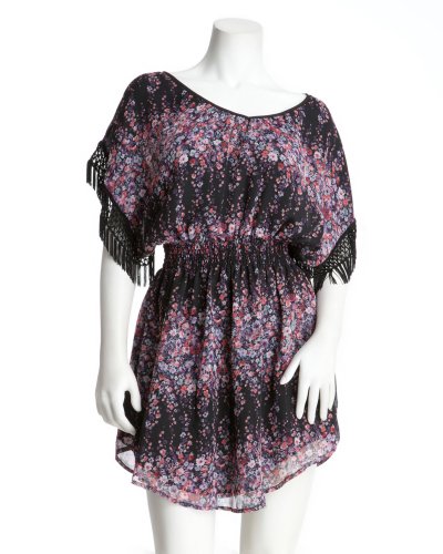 Fringe detail at shoulders, girly floral print, smock elastic waistband detail and V-neckline make this 2b dress a gypsy-chic taste on daytime dressing. Amp it up with feathered earrings. Center back to hem: 33".